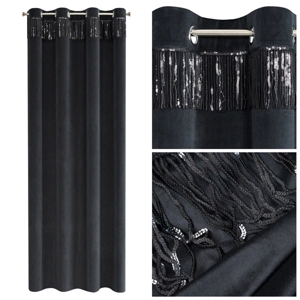 Curtain from Jasper collection these decorations in modern style, made of soft and delicate velvet. The upper part is decorated with a band of shiny sequins, which accentuates the uniform pattern of the product. The whole creates a phenomenal effect in the room, decorated in a fashionable and original style. The curtain will look beautiful in the living room or bedroom, emphasizing the appearance of the room. It fulfills not only visual, but also practical functions. The curtain effectively insulates the sun's rays, creating a pleasant atmosphere in the room and providing privacy. Hanging on 8 grommets , the application of the product on the curtain rod takes only a short moment. It is a suggestion especially for those who have a taste for chic glamour style.