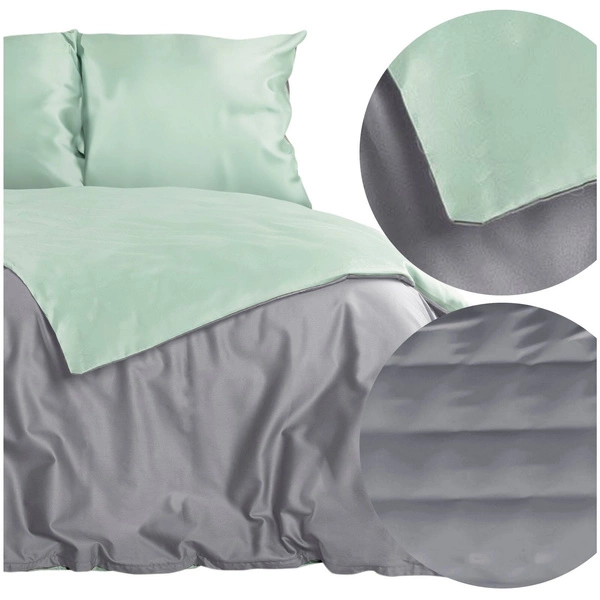 - A set of double-sided bedding, made of great quality cotton satin with a thick weave. The bedding has a smooth surface and a delicate sheen. To the touch it is pleasant, soft and behaves very well during washing. Gray-mint color.