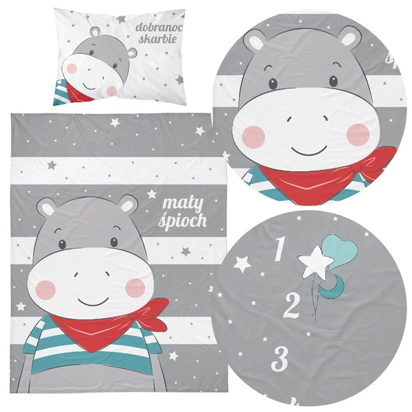 Bamboo bedding is made of eco-friendly fabric 50% cotton and 50% bamboo fiber, which is ideal for the baby's crib, because the whole set is very pleasant to the touch and does not irritate the skin. Thanks to the combination of cotton and bamboo product has thermoregulation and antibacterial properties. An additional advantage is the durability of the material. The set is fastened with a practical zipper which will make it easy to change the bedding. Wonderful patterns used on each bedding will make the toddler happier and the quality of the bedding will allow a wonderful sleeping comfort. The gray and white striped background and stars depict a smiling hippo and the inscription little sleeper.