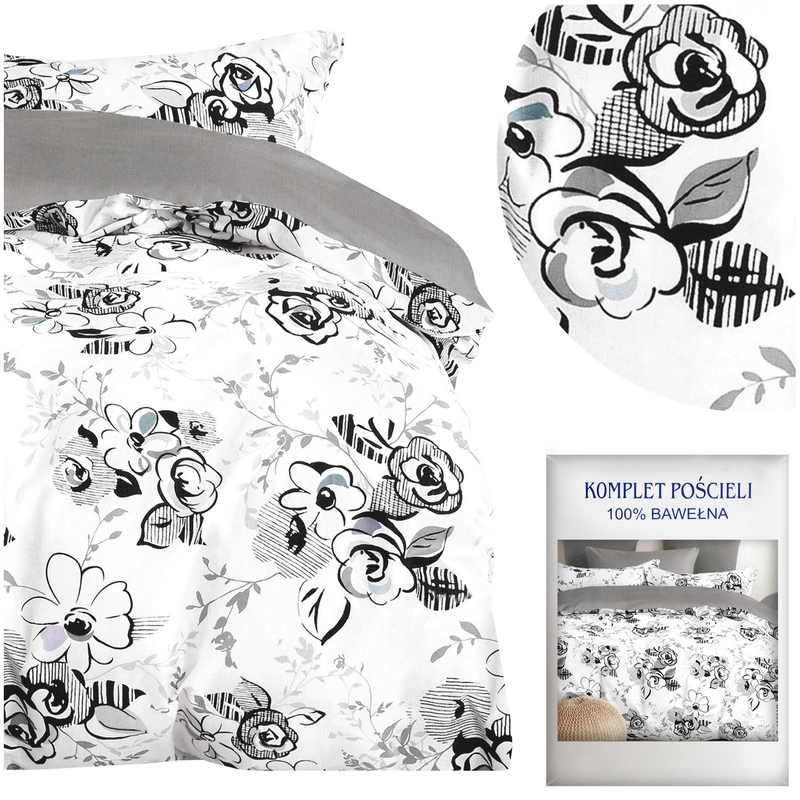 Cotton satin bedding is a high-quality fabric with a satin weave of cotton fibers, providing exceptional softness. This type of fabric is distinguished by a delicate sheen and is velvety to the touch. The high structure of the fibers allows air to circulate freely, so that, in winter it gives us warmth and in summer it cools. The natural composition ensures that our skin will be able to breathe freely under it. Another advantage of bedding is its ease of use as it is not slippery, very well adheres to the quilt. The set in the colors of gray and white shows densely arranged flowers. The other side is solid.