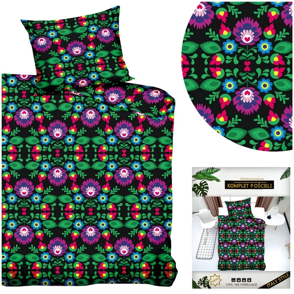 Excellent color rendering and modern designs are characteristic features of Dalwin bedding. Lovers of unconventional motifs will appreciate their creativity, and fans of stylish colors will be entranced. The set, thanks to its simplicity and elegance, will meet the expectations of every customer. The bedding depicts the Lowicz colorful patterns, flowers and leaves on a black background.