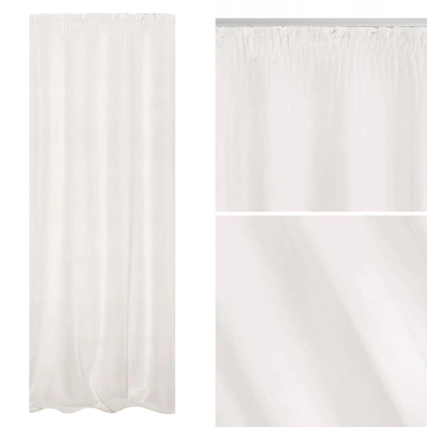 It has a standard size of 140x270 cm and fastening in the form of a tape, which can be put on the curtain rod with the help of jabs, hooks or even a tunnel.