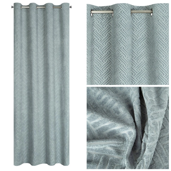 A jacquard geometric pattern obtained by weaving decorates the whole, creating a unique design. The thicker pattern is interspersed with thinner, translucent elements, so the curtain creates an interesting openwork effect in the window.