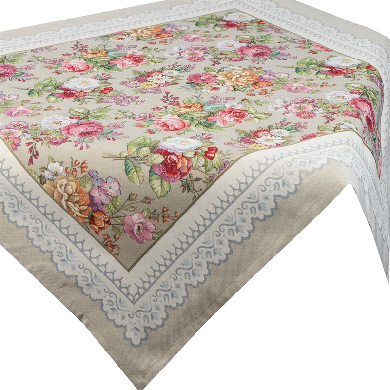 - Tapestry tablecloth with embroidered flowers and piping with lace motif.