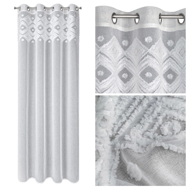 Estera curtain will fit especially into rooms decorated in boho and eco style. Its upper part is decorated with an applique with a geometric pattern, which distinguishes the whole product adding elegance to it. The thick weave makes it a good shield against excess sunlight. The curtain will look great in the living room or bedroom, where it will decorate the interior while performing its functions. Practical grommets allow you to quickly hang it on the curtain rod and enjoy a tasteful decoration.