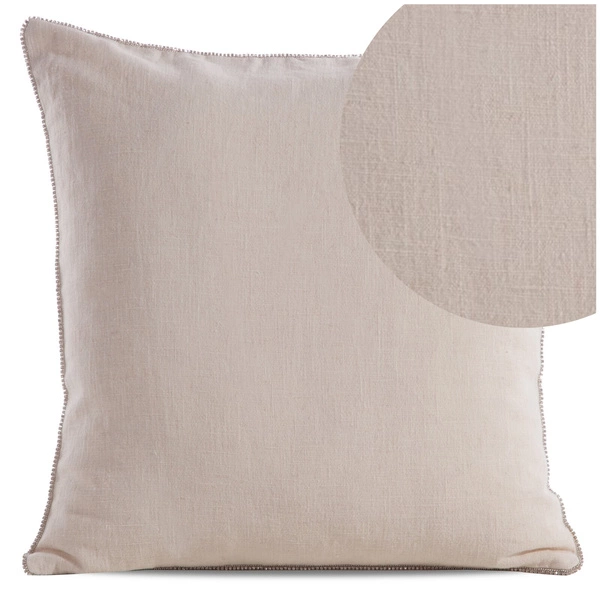 Linen pillowcase in cream color was made fromlinen fabric with the addition of cotton and decorated with small zirconsand beads, which were sewn on the edges. The addition of these shiny elements contrasts perfectly with the simplicity of the designed eco-style pillowcase, creating a modern design. It is equipped with a zipper, so its replacement will be quick and efficient.