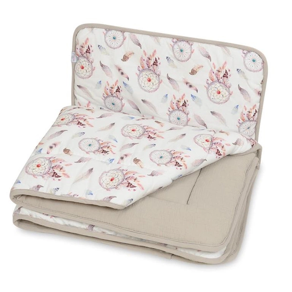 Muslin quilt and pillow is the perfect choice for your little ones' cribs! The set is double-sided - the top side is decorated with a print with dreamcatchers, while the bottom side is in a solid beige shade.
