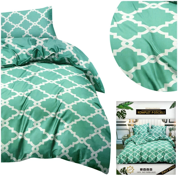 Excellent color rendering and modern designs are characteristic features of Dalwin bedding. Lovers of unconventional motifs will appreciate their creativity, and fans of stylish colors will be entranced. The set, thanks to its simplicity and elegance, will meet the expectations of every customer. It depicts a Moroccan clover pattern on a mint background.