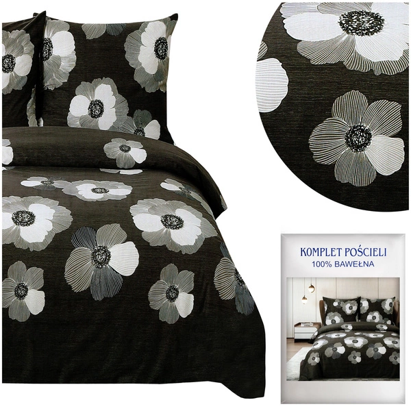 Cotton satin bedding is a high-quality fabric with a satin weave ofcotton fibers, providing exceptional softness. This type of fabric is distinguished by a delicate sheen and is velvety to the touch. The high structure of the fibers allows free air circulation, so that, in the winter it gives us warmth and in the summer it cools. The natural composition of ensures that our skin will be able to breathe freely under it. An additional advantage of the bedding is its ease of use as it is not slippery, it adheres very well to the quilt. The set depicts flowers on a dark background.