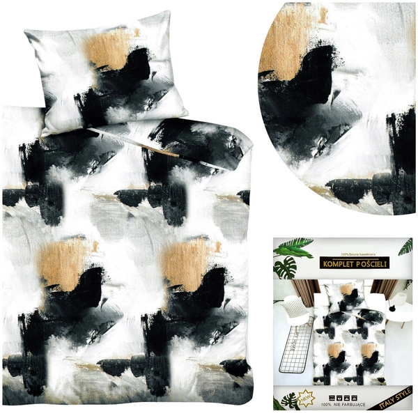 Excellent color rendering and modern designs are characteristic features of Dalwin bedding. Lovers of unconventional motifs will appreciate their creativity, and fans of stylish colors will be entranced. The set, thanks to its simplicity and elegance, will meet the expectations of every customer. The presented model shows a gray-gold print on a white background.