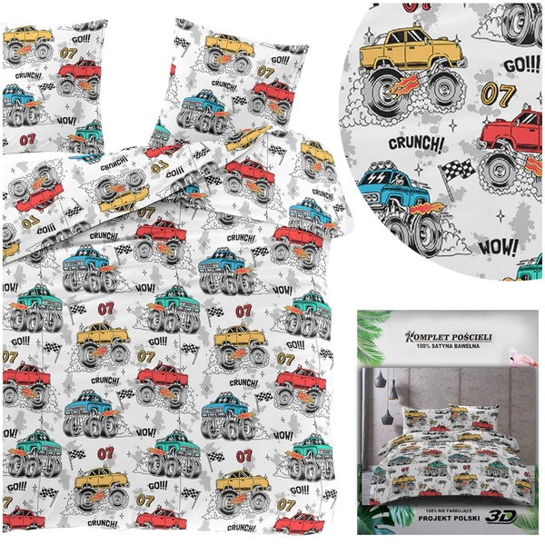 The print that is on the material was applied with 3D technology. Excellent color rendering and modern designs are the hallmarks of this collection. On the set there is a children's print depicting cars.