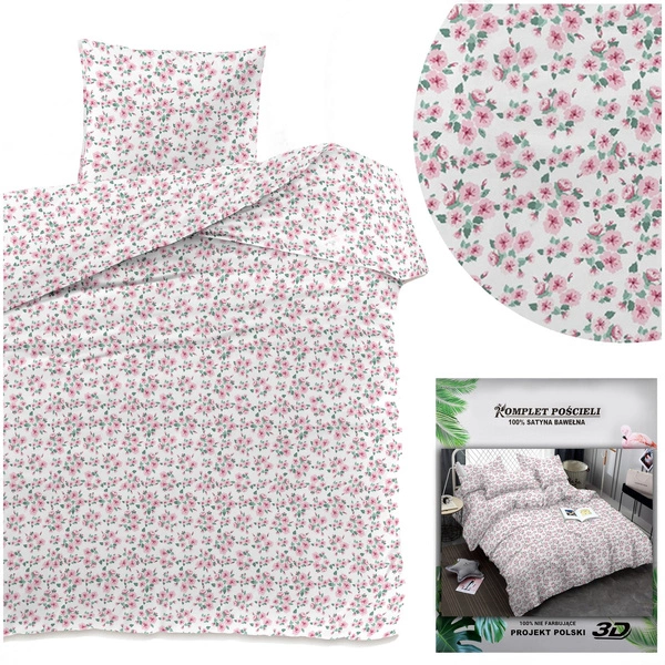 The print that is on the material was applied with 3D technology. Excellent color rendering and modern designs are the hallmarks of this collection. On the set there is a print depicting delicate pink flowers on a light background.
