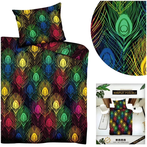 Excellent color rendering and modern designs are characteristic features of Dalwin bedding. Lovers of unconventional motifs will appreciate their creativity, and fans of stylish colors will be entranced. The set, thanks to its simplicity and elegance, will meet the expectations of every customer. The presented model shows colorful peacock feathers on a black background.