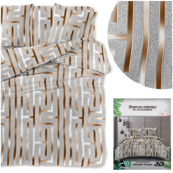 The print that is on the material was applied with 3D technology. Excellent color rendering and modern designs are the hallmarks of this collection. The set features a print depicting gold patterns on a gray background.
