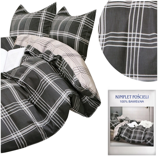 Cotton satin bedding is a high-quality fabric with a satin weave ofcotton fibers, providing exceptional softness. This type of fabric is distinguished by a delicate sheen and is velvety to the touch. The high structure of the fibers allows free air circulation, so that, in the winter it gives us warmth and in the summer it cools. The natural composition of ensures that our skin will be able to breathe freely under it. Another advantage of the bedding is its ease of use because it is not slippery, it adheres very well to the quilt. The set shows a large checkered pattern on dark gray background .