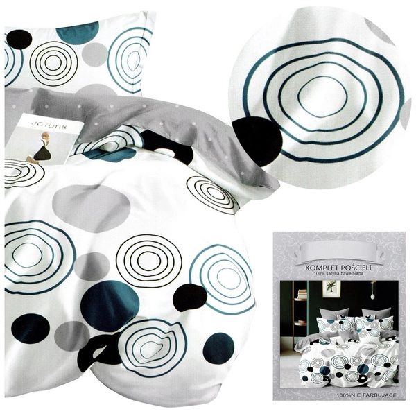 Melita bedding is made of cotton satin, and thanks to a special weave it has a light sheen. It is soft and pleasant to the touch and has extremely vivid and saturated colors that will delight the most demanding customer. The bedding is distinguished by a fashionable and elegant design, so it is sure to fit into any interior. The set depicts circles on a white background.