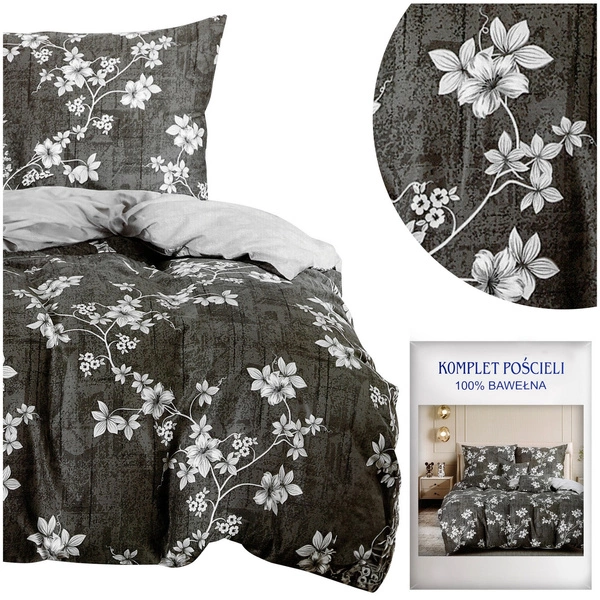 Cotton satin bedding is a high-quality fabric with a satin weave ofcotton fibers, providing exceptional softness. This type of fabric is distinguished by a delicate sheen and is velvety to the touch. The high structure of the fibers allows free air circulation, so that, in the winter it gives us warmth and in the summer it cools. The natural composition of ensures that our skin will be able to breathe freely under it. An additional advantage of the bedding is its ease of use as it is not slippery, it adheres very well to the quilt. The set in a shade of gray depicts flowers.