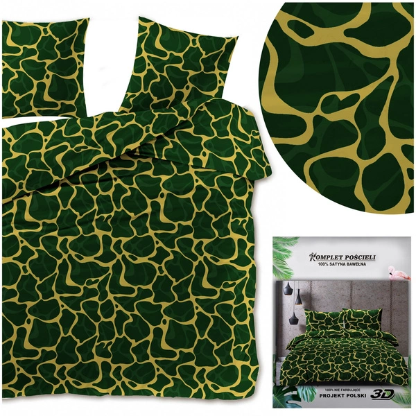 The print that is on the material was applied with 3D technology. Excellent color rendering and modern designs are the hallmarks of this collection. On the set there is a print depicting a golden pattern on a green background.
