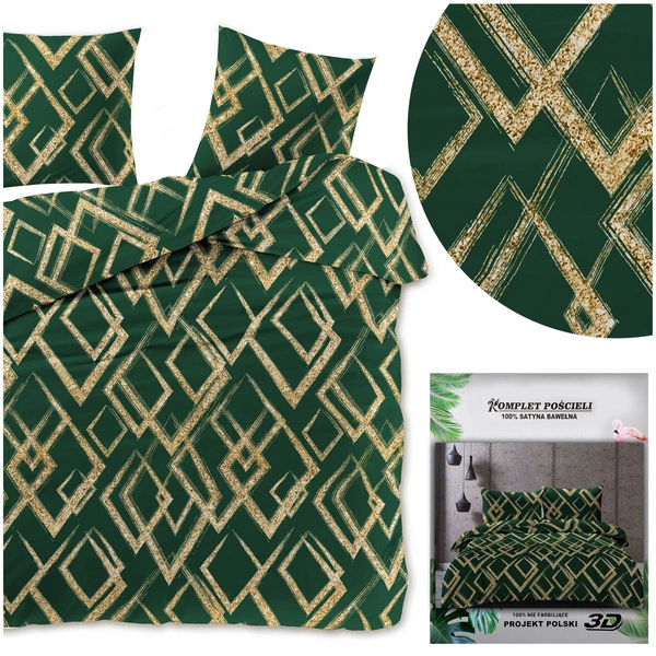 The print that is on the material was applied with 3D technology. Excellent color rendering and modern designs are the hallmarks of this collection. On the set there is a print showing geometric patterns on a green background.