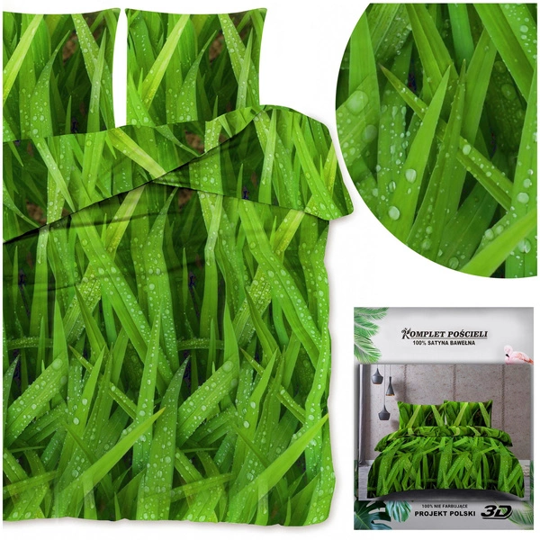 The print on the fabric is applied using 3D technology. Excellent color reproduction and modern patterns are characteristic features of this collection. The set features a print of green grass.