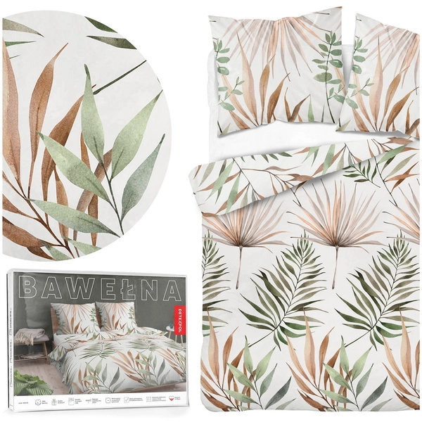 The bedding set VICENZA features a minimalist and very aesthetic trendy design. Subdued colors will make your sleep more comfortable and peaceful than ever before. The bedding is made of high-quality 100% cotton, making it incredibly pleasant to the touch and skin-friendly. The pattern features brown and green leaves on a white background.