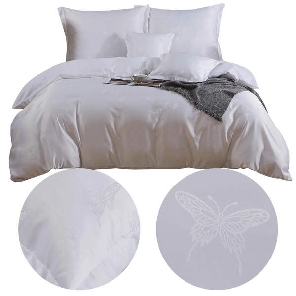 The outer side features a beautiful, satin weave adorned with delicate embroidery, adding elegance, while the smooth inner side offers maximum comfort. The subtly shimmering butterflies add a luxurious character, and the dominant colors – whites, creams, grays, and beiges – will bring subtle elegance to your bedroom.