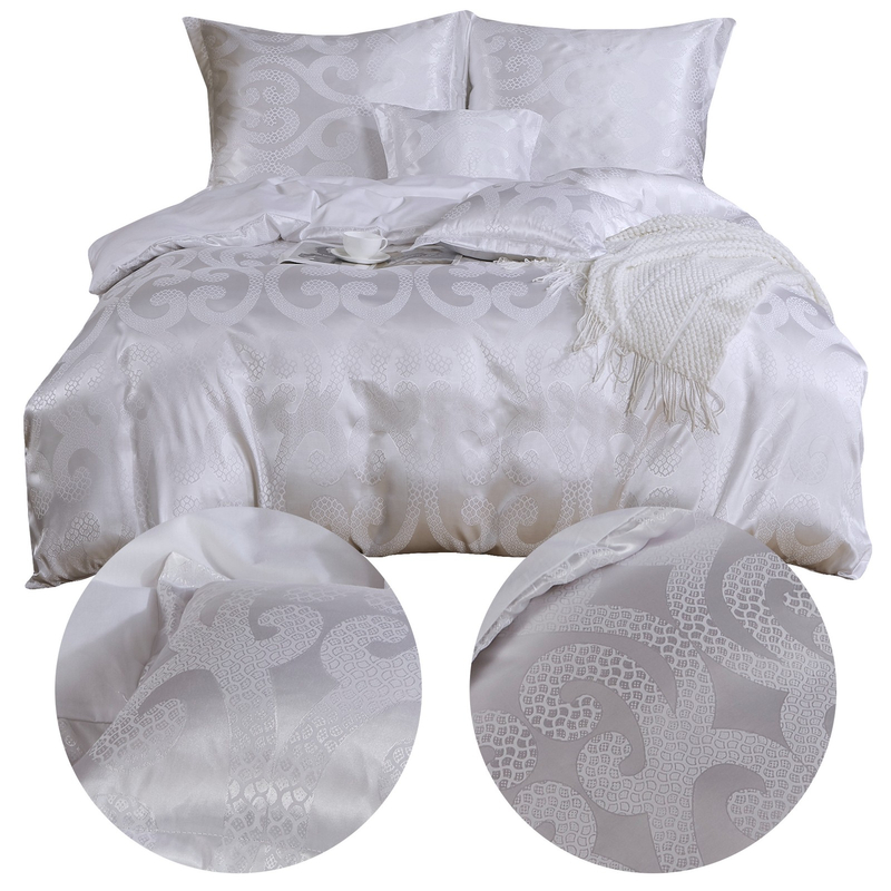 The outer side features a beautiful, satin weave adorned with delicate embroidery, adding elegance, while the smooth inner side offers maximum comfort. The lightly shimmering ornaments add a luxurious character, and the dominant colors – whites, creams, grays, and beiges – will bring subtle elegance to your bedroom.