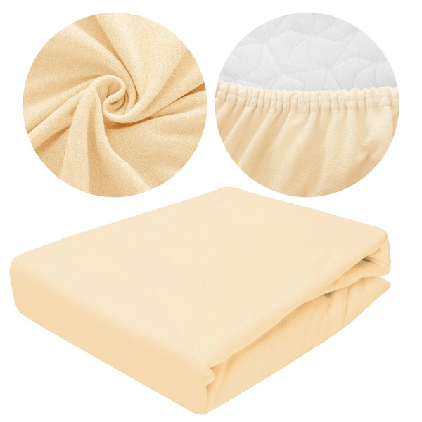 Jersey fitted sheet of high quality fabric. Made from soft and pleasant to the touch material, 48% cotton and 52% polyester. It has a delicate structure, is resilient and elastic. Designed for a mattress with a height of up to 15 cm. The allowance for mattress height is not added to the basic size. The sheet has elastic all around, sewn into a tunnel, which allows it to fit perfectly to the mattress and always stay in place. It performs excellently during use, does not bunch up or shift during sleep, providing high comfort. It does not require ironing because once placed on the mattress, wrinkles disappear. It is breathable and dries quickly. It does not pill and does not lose color even after many washes.