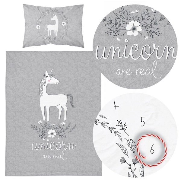 The bamboo bedding is made of eco-friendly fabric made of 50% cotton and 50% bamboo fiber, which is ideal for the baby's crib, as the whole set is very pleasant to the touch and does not irritate the skin. Thanks to the combination of cotton and bamboo, the bedding has thermoregulation and antibacterial properties. An additional advantage is the durability of the material. The set is fastened with a practical zipper which makes it easy to change the bedding. Wonderful patterns used on each bedding will make the toddler happier and the quality of the bedding will allow for wonderful sleeping comfort. The bedding depicts a unicorn on a gray background with the inscription "unicorn are real".
