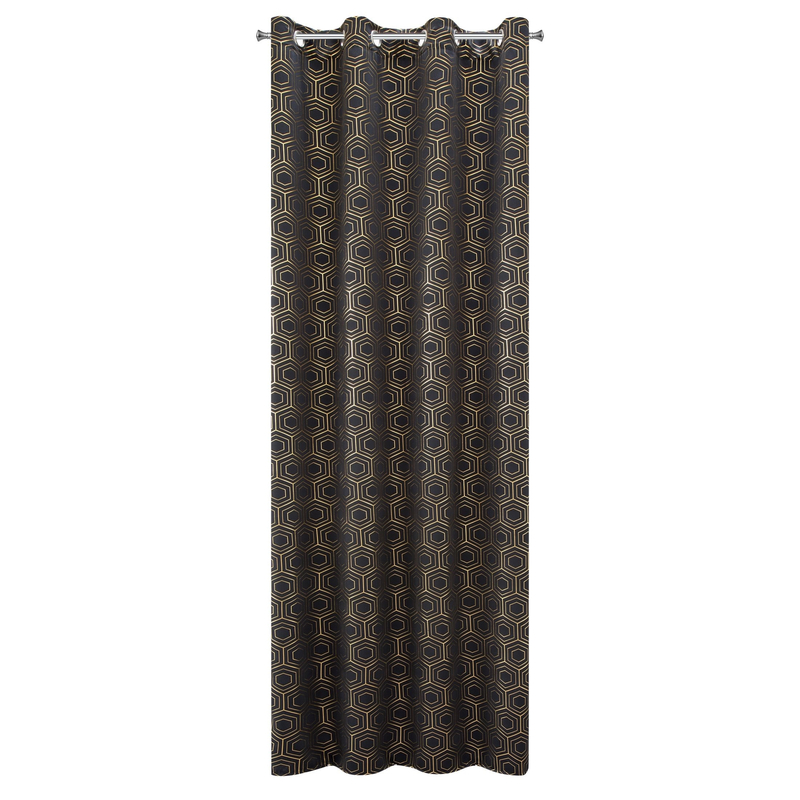 - Blackout curtain of modern style with geometric gold pattern on black background. Elegant decoration hung with even grommets.