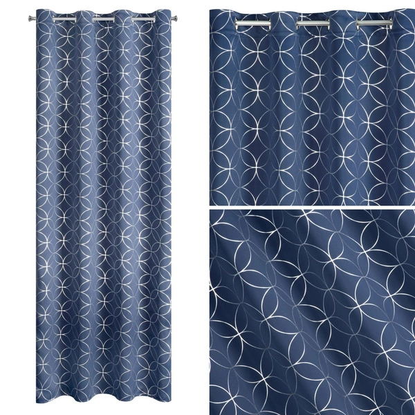 - Blackout curtain of modern style with a pattern of silver circles on a background of navy blue color. Elegant decoration hung with even grommets.