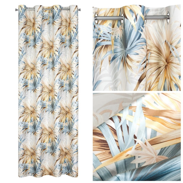 The curtain is made of pleasant to the touch fabric. Yellow and blue leaves are perfectly matched to the white background of the product. The whole thing is easy to install on any type of curtain rod, and the grommets make it easy to arrange even waves on it. It provides comfort in use and privacy from unwanted eyes of passersby.