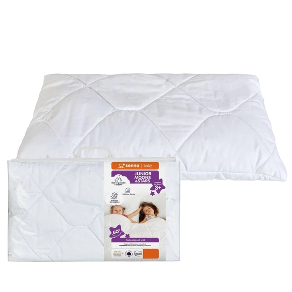The pillow is made from a very pleasant material that mimics peach skin. Thanks to its soft yet durable three-layered quilted design, the product is very durable. It is adorned with a delicate pattern of stars and moons. The soft balls that fill the pillow adapt to the head of the sleeper, providing excellent rest. The product is recommended for allergies.