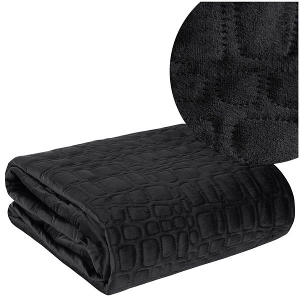 The Salvia bedspread is a decorative element that will bringa chic atmosphere to the bedroom and refresh the interior of the room. The universal black color is decorated with innovative quilting depicting a crocodile skin pattern. Soft velvet, from which the bedspread was made, is characterized by a delicate sheen and looks very stylish. Thanks to the microfiber underside, the product does not slip off the bedding. Elastic filling allows the bedspread to be aesthetically arranged on the bed. In addition, hot-press quilting guarantees longer life and durability of the material, as well as a distinct pattern.