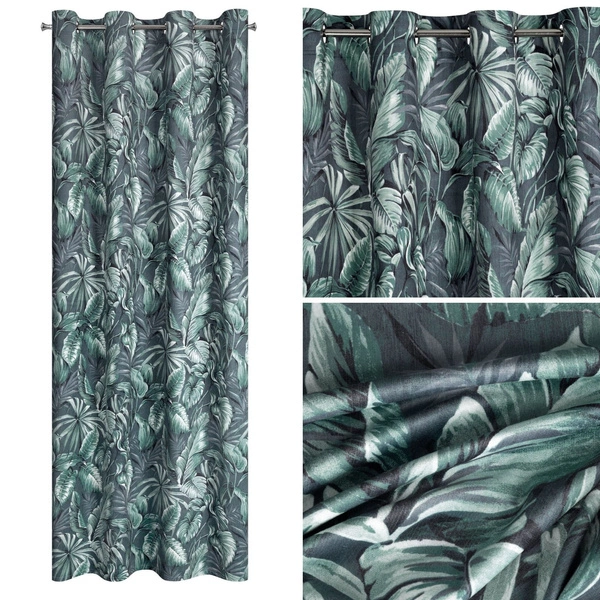- Beautifully made elegant PALERMO curtain with a print of green leaves on a gray background. It is hung with grommets.