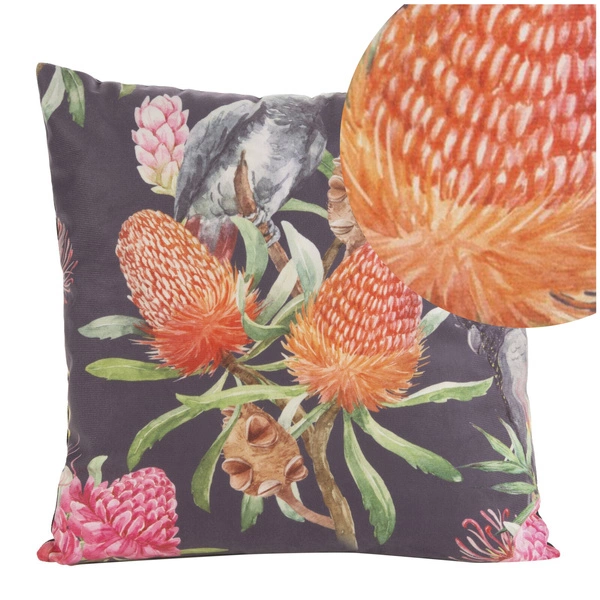 Aksamitna w dotyku poszewka, która została wykonana z bardzo dobrej jakości materiału o wykończeniu welurowym. Na urokliwy deseń artykułu składa się czarny kolor oraz niezmiernie efektowny wzór roślin i ptaków.