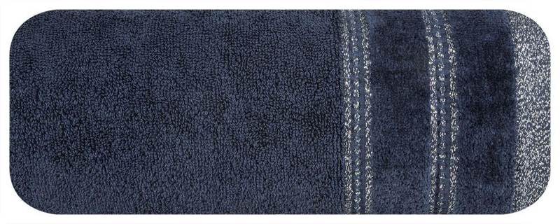 Ręcznik Glory2 w kolorze granatowym został wykonany z wysokiej jakości bawełny o splocie frotte. Tkanina jest bardzo miękka i miła w dotyku oraz dobrze chłonie wodę. Kolory nie tracą swojej intensywności nawet po wielokrotnym praniu. Klasyczny granatowy kolor został wzbogacony o minimalistyczną bordiurę z weluru z dodatkiem błyszczącej nici. Dzięki temu charakteryzuje się wyrafinowaną prostotą, która jednocześnie idealnie wpasuje się w nowoczesną aranżację łazienki. Sprawdzi się również jako praktyczny prezent np. na parapetówkę.