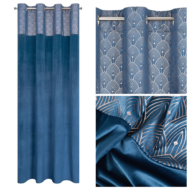 Granatowy deseń zasłony Agnes został ozdobiony nadrukiem w stylu orientalnym. Umieszczony w górnej części produktu motyw wkomponuje się szczególnie w nowoczesne wnętrza, dodając mu uroku. Welwetowa, aksamitna tkanina zapewnia dobre zaciemnienie, dzięki czemu ochronisz się przed promieniami słonecznymi lub wzrokiem sąsiadów. Praktyczne zawieszenie na przelotki sprawia, że zasłona będzie pięknie układała się na karniszu, a aplikacja produktu jest bardzo szybka i funkcjonalna. Dzięki zasłonie Agnes stworzysz oryginalny wystrój pomieszczenia oraz wprowadzisz niepowtarzalny klimat.