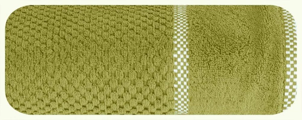 - Ręcznik frotte w kolorze oliwkowym z dekoracyjną bordiurą w krateczkę.
