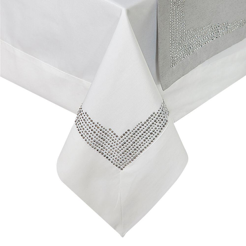 • Klasyczny obrus stołowy z nowoczesnym zdobieniem na rogach. Dekorowany dżetami.