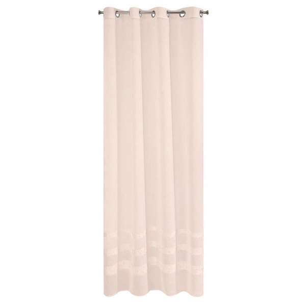 - Jednokolorowa, zwiewna firana z etaminy udekorowana w dolnej części poziomymi pasami z dodatkiem moherowej nici.