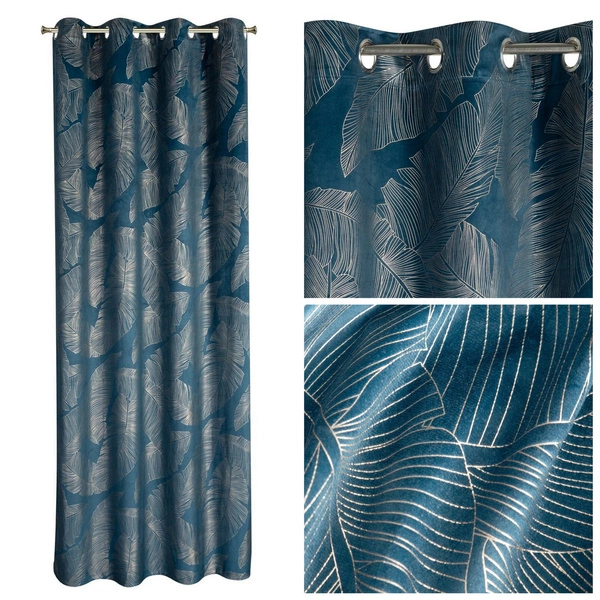 Zasłona Musa 2A ukazuje botaniczny motyw liści bananowca na granatowym tle. Welwetowa tkanina jest przyjemna w dotyku oraz dość gruba, dzięki czemu produkt daje nam poczucie prywatności i chroni przed światłem słonecznym. Praktyczne przelotki umożliwiają bezproblemowe założenie zasłony na karniszu oraz ułożenie miękkich i regularnych fal. Zasłona będzie idealnie prezentować się w nowoczesnych wnętrzach, powiększając optycznie pomieszczenie.