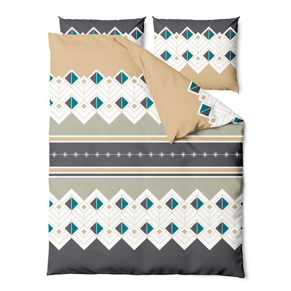 Pościel została wykonana z wysokiej jakości bawełny. Jest bardzo miła, delikatna i miękka w dotyku, a zarazem lekka i ciepła. Dzięki temu może być stosowana latem, jak i zimą zapewniając optymalne ciepło. Tkanina bawełniana dobrze przepuszcza powietrze, nie przegrzewając ciała. Kolejnym atutem jest jej higroskopijność. Pościel łatwo wchłania wilgoć, co szczególnie sprawdzi się w upalne dni, zapewniając tym samym komfortowy wypoczynek. Nadruk przedstawiający geometryczne wzory oraz pasy wpasuje się w nowoczesne i klasyczne aranżacje wnętrz, podkreślając styl sypialni.