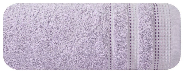 • Jednobarwny ręcznik z miękkiej i chłonnej tkaniny bawełnianej o splocie frotte zdobiony kolorową bordiurą w stylu fastrygi.