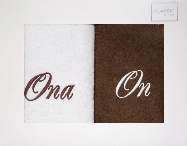 Zestaw zawiera dwa ręczniki w różnych kolorach. Na jednym widnieje napis „Ona” a na drugim „On”. Zapakowany w estetyczne kartonowe pudełko będzie wspaniałym prezentem dla pary, która urządza nowe mieszkanie w nowoczesnym stylu.
