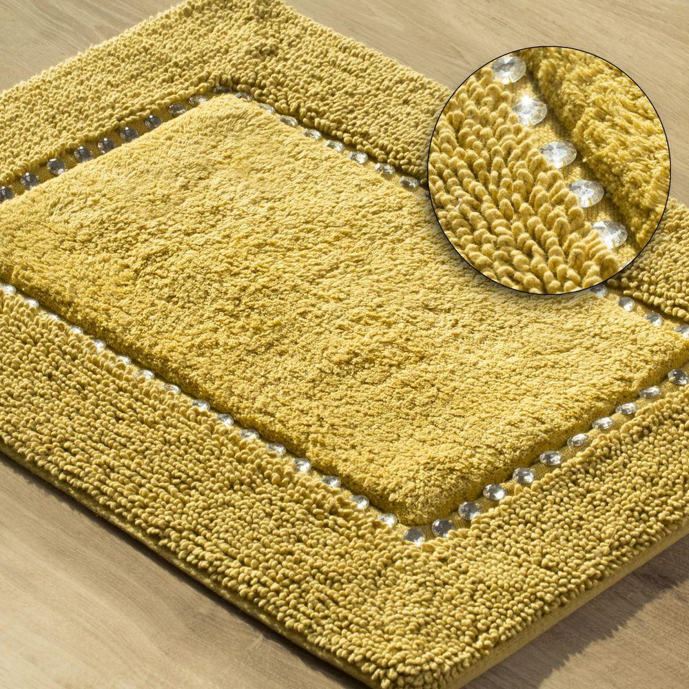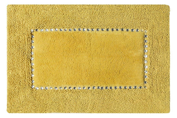 Dywan Chic to połączenie wysokiej jakości materiału, komfortu użytkowania oraz modnej stylistyki glamour. Musztardową barwę urozmaicają błyszczące kryształki ułożone w formie kwadratu. Produkt jest miły w dotyku, zapewnia miękkość stopom, chroniąc je przed zimnymi płytkami w łazience. Ze względu na swoją formę dywanik sprawdzi się również jako dekoracja salonu lub innego pokoju, dając gwarancję produktu, które wpasuje się w obecne trendy.