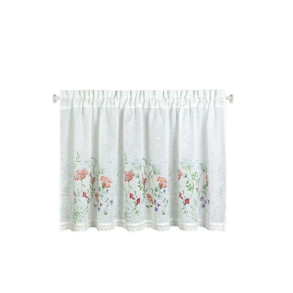Modna firanka, wykonana w stylu rustykalnym to świetny element dekoracyjny, dzięki któremu wnętrze nabierze przytulnego klimatu. Piękny nadruk polnych kwiatów oraz ozdoba bawełniana koronka podkreśli styl kuchni, wprawiając w zachwyt wszystkich domowników. Wykonana z etaminy gwarantuje zachowanie prywatności, ale również delikatne, naturalne światło. Zawieszanie na taśmę umożliwia bezproblemowe założenie firany.