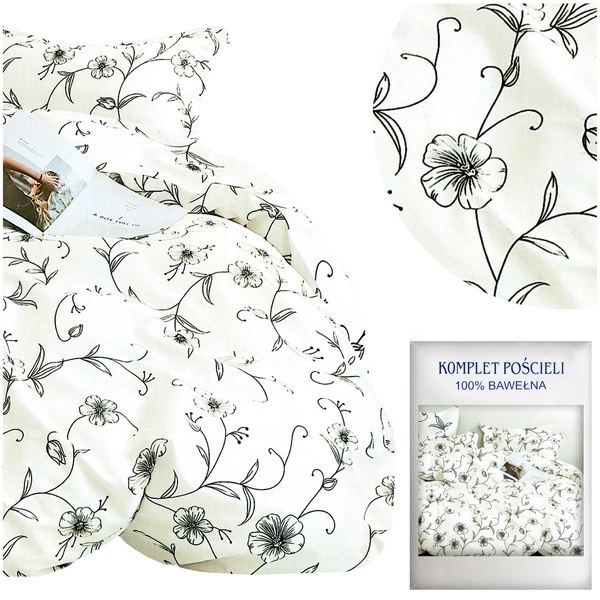 Pościel z satyny bawełnianej to wysokiej jakości materiał o splocie satynowym z włókien bawełnianych, zapewniający wyjątkową miękkość. Ten rodzaj tkaniny wyróżnia się delikatnym połyskiem i jest aksamitny w dotyku. Wysoka struktura włókien pozwala na swobodną cyrkulację powietrza, dzięki czemu, zimą daje nam ciepło a latem chłodzi. Naturalny skład zapewnia, że nasza skóra będzie mogła pod nią swobodnie oddychać. Dodatkowym atutem pościeli jest jej łatwość użytkowania gdyż nie jest śliska, bardzo dobrze przylega do kołdry. Komplet przedstawia kwiaty i liście na kremowym tle.