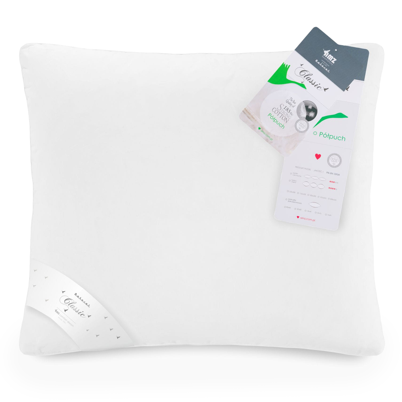 - Klasyczna poduszka, szyta tradycyjną metodą. Wypełniona w 20% naturalnym puchem gęsim i w 80% miękkimi, drobnymi piórkami. Pokryta mocnym inletem bawełnianym.