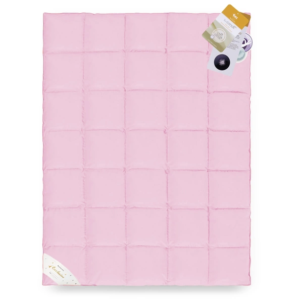 Wyroby zostały pokryte miękkim inletem bawełnianym o gramaturze 130 g/m2. Uszyte w technologii ciepłego szwu, zapewniając odpowiednią termoizolacje na całej powierzchni . Wypełniona polskim gęsim puchem 70% (pozostałe 30% to miękkie, drobne piórka puchowe). Użyty puch jest surowcem wysokiej jakości, posiadającym wysoką wyporność. Dzięki czemu produkty są lekkie przy zachowaniu wysokiego współczynnika termoizolacji oraz niesamowicie sprężyste. Wypełnienie przygotowane jest zgodnie z normami europejskimi i jest całkowicie bezpieczne. Kołdra o budowie kasetonowej - szyta w technologii ciepłego szwu zapewniającemu lepsze właściwości termoizolacyjne. Kratki są szczelnie zamknięte uniemożliwiając przemieszczaniu się wypełnianiu pomiędzy komorami. Białe wyroby wykończone są białą bizą, kremowe bizą koloru złotego, a różowe białą. Produkt z atestem PZH wydanym przez Narodowy Instytut Zdrowia Publicznego. Wyroby z tej kolekcji zapakowane są w reprezentacyjne opakowania foliowo-materiałowe.